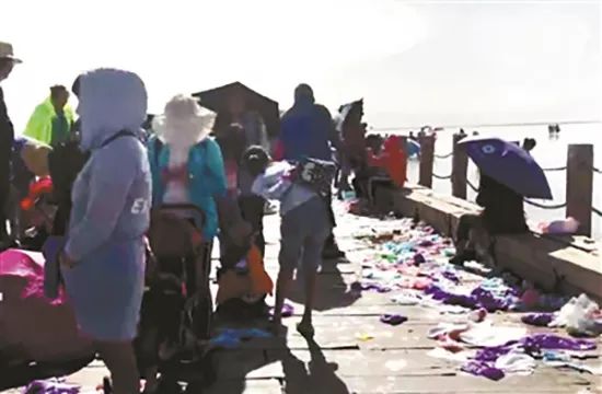 一则游客拍摄的视频显示,茶卡盐湖边的栈道上挤满了前来参观的游客,游客的脚下则散落着不少颜色各异的塑料垃圾。现场有景区工作人员不断捡拾着垃圾,同时播放着“请将垃圾扔入垃圾桶内”的广播。