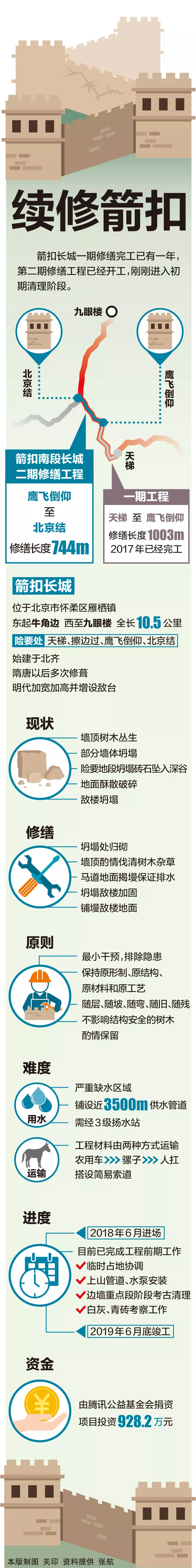 去年箭扣长城启动大修,从“天梯”至“鹰飞倒仰”1003米的一期修缮工程当年完成。就在不久前,从“鹰飞倒仰”到“北京结”,共744米长的箭扣长城二期修缮工程也已经启动。