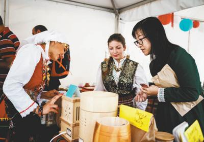 一名中国游客(右一)在保加利亚莫斯利安村品尝当地生产的特色酸奶。