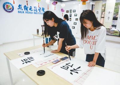 留学生在中国地质大学丝绸之路学院学写毛笔字。