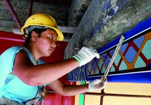 景山公园助力中轴线申遗,工人正在对观德殿进行整修。