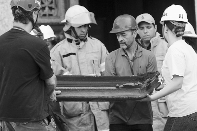 9月3日,在巴西城市里约热内卢,消防员与国家博物馆工作人员搬运一幅被烧毁的画作。