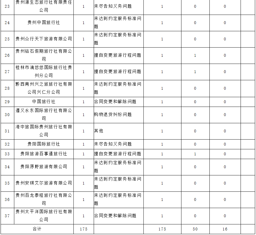 统计结果显示,暑期全省共接到旅游投诉309件,其中投诉旅行社175起,占投诉总量的56.63%,违法违规线索50条,占旅行社投诉案件的28.57%,依法立案16起;按投诉对象来划分未达到约定服务标准问题的88起,占旅行社投诉总数50.28%,合同变更和解除问题的22起,占旅行社投诉总数12.57%,擅自变更旅游行程问题30起,占旅行社投诉总数的17.14%。