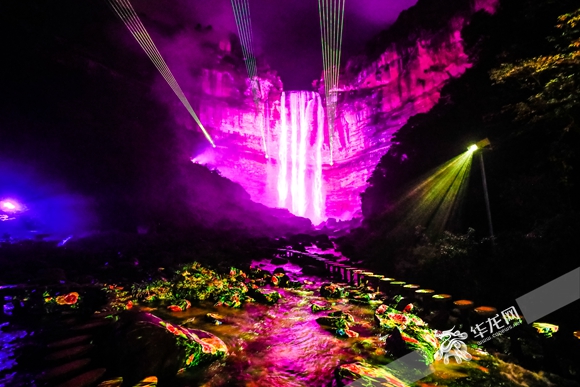 与此同时,崖壁上的彩色灯光勾勒出心形、少男少女等多种爱情元素图案,伴随着“情定四面山”几个大字的闪烁,以爱情为主题的动态光影画卷笼罩了整个望乡台。