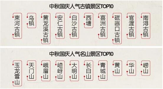 得益于此,古镇、山水为主题的周边游再度走俏,据途牛监测数据显示,截止9月12日,双节假期预订人气较高的古镇景区TOP10为束河古镇、乌镇、黄龙溪古镇、安仁古镇、白沙古镇、西塘、喜洲古镇、磁器口古镇、官渡古镇、南浔古镇。同时,玉龙雪山、天门山、峨眉山、嵖岈山、大明山、长白山、青城山、黄山、华山、崂山、泰山等名山受到喜爱在秋季登高望远用户的青睐。