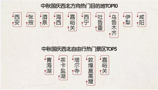 双节期间,西安、张掖、酒泉、海西、嘉峪关、西宁、吐鲁番、乌鲁木齐、伊犁、咸阳等地成为预订最火热的旅游目的地;青海湖、茶卡盐湖、塔尔寺、敦煌莫高窟、嘉峪关等西北景区颇受自助游游客的喜爱。