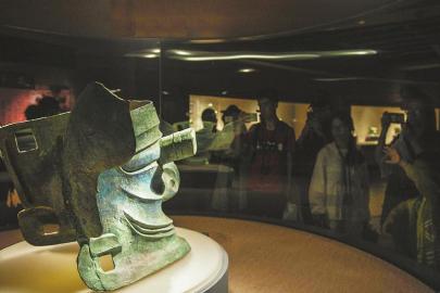 三星堆博物馆的铜纵目面具。本报记者 杨树 摄