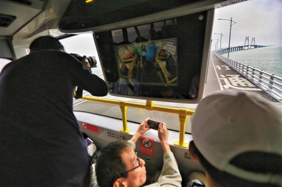 今早,港珠澳大桥正式通车,在珠海至香港的穿梭巴士上,游客争拍大桥雄姿 羊城晚报记者 宋金峪 汤铭明 摄