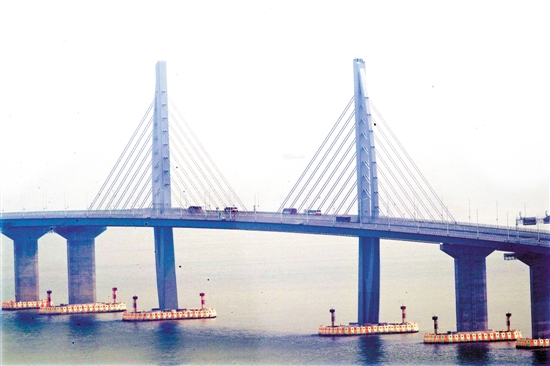 今早9时多,巴士穿梭在港珠澳大桥九洲航道桥上 羊城晚报记者 林桂炎 摄