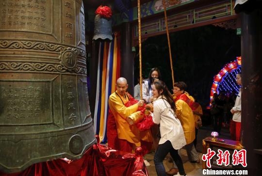 中新网三亚1月1日电 (王晓斌 王晨)2018年12月31日晚,海南三亚南山寺举行撞钟祈福迎新系列民俗文化活动,市民游客在钟声与梵音中迎接新年的到来。