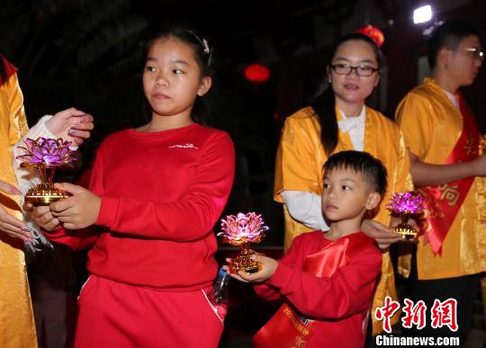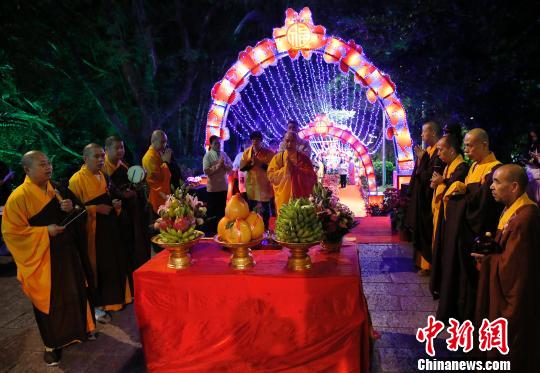 在三亚南山寺,市民游客参与传灯法会。 王晓斌 摄
