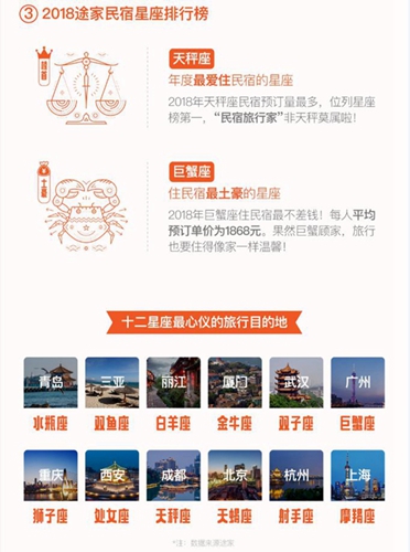 从用户星座属性看,2018年天秤座中平均每人订过民宿次数最多,“民宿旅行家”非天秤莫属;而巨蟹座中每人平均预订单价为1868元,成为最不差钱星座。不同星座的用户对不同的城市也各有青睐,如白羊座爱丽江,处女座倾向西安,狮子座迷恋重庆,而天秤座更喜欢成都。