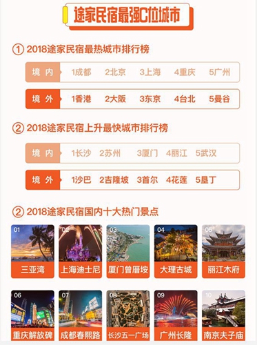 2018年,境内最受欢迎的民宿城市为成都、北京、上海、重庆、广州、西安、厦门、三亚、杭州、丽江;境内最受欢迎的民宿景点为三亚湾、上海迪士尼、厦门曾厝垵、大理古城、丽江木府、重庆解放碑、成都春熙路、长沙五一广场、广州长隆、南京夫子庙;境外最受欢迎的民宿城市为香港、大阪、东京、台北、曼谷、京都、屏东(垦丁)、清迈、普吉岛、芭提雅。