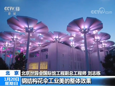 北京建工北京世园会国际馆工程副总工程师 刘志栋:白天从外观可以看到国际馆钢结构花伞的整体效果,然后晚上可以通过咱们的夜景照明呈现出百花齐放、五色斑斓的花伞花海效果。