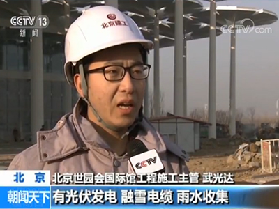 北京建工北京世园会国际馆工程施工主管 武光达:它那个屋面其实功能比较强大,有光伏发电、融雪电缆、雨水收集,室内就是一个遮阳还有保温效果。雨水从钢柱里面流下来直接汇到雨水调蓄池,用于灌溉和建筑功能的使用。