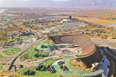 长城脚下,北京延庆,肃穆的海坨山和官帽山遥相对望,拥抱着冰封的妫河。河岸桥畔,一条条道路错落有致,一座座场馆拔地而起……1月19日北京世园会开幕迎来倒计时100天。100天后的4月29日,在这里,由中国政府主办、北京市政府承办的2019年中国北京世界园艺博览会将拉开帷幕。图为无人机拍摄的北京世园会中国馆。 供图/新华社