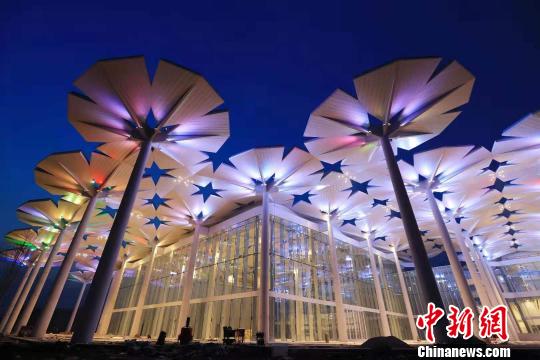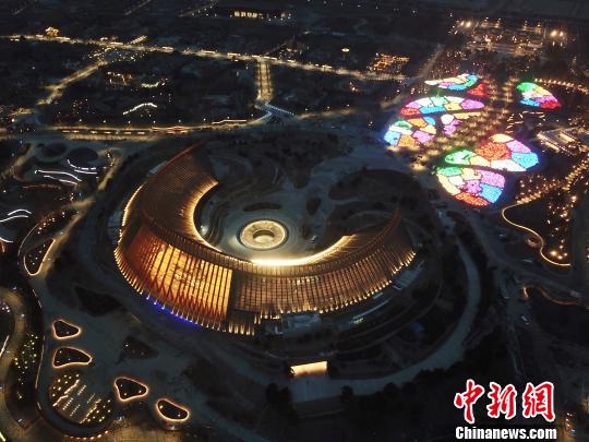 北京世园会依托山水林田肌理,在500余公顷土地上营建近百余个风格迥然、形态各异的“园中园”。图为国际馆夜景图。北京世园局供图