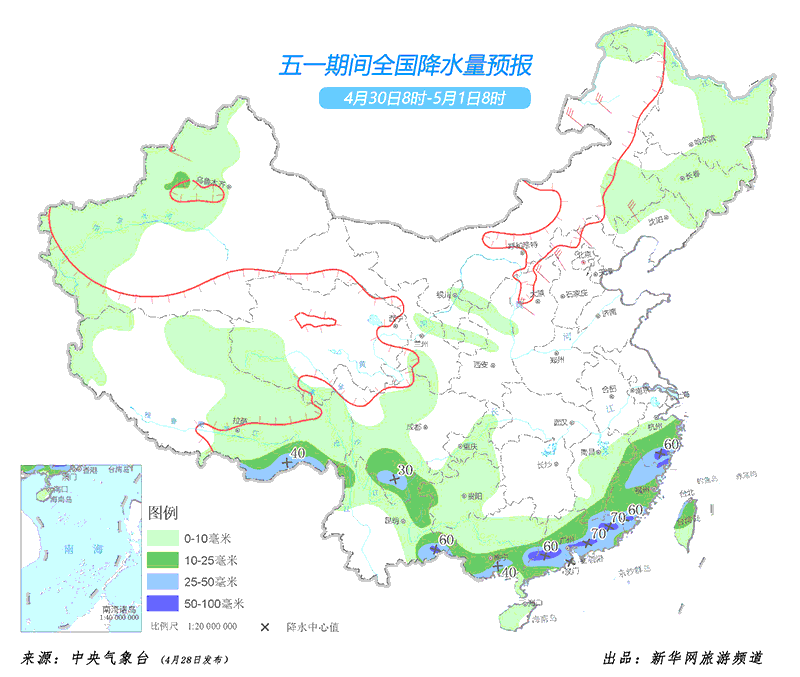 从目前预报来看,5月1日当天,我国虽然整体降水范围不大,但东部沿海人口较密集区域,西南部分地区以及新疆北部和西部会有些阴雨天气。不过,降雨普遍不强,对出行影响不大。