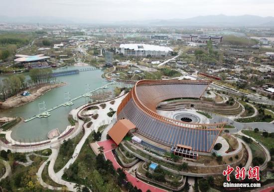 资料图:无人机拍摄的北京世园会中国馆。中新社记者 毛建军 摄