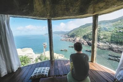 游客在浙江省温州市平阳县南麂岛一家悬崖民宿酒店的海景房内观赏海景。新华社记者 徐 昱摄