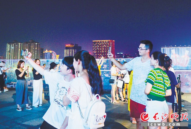 在长沙国金中心7楼平台,游客们正在拍照。