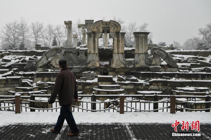 12月16日,北京迎来大雪天气,一名游客在圆明园内欣赏雪景。中新社记者 崔楠 摄