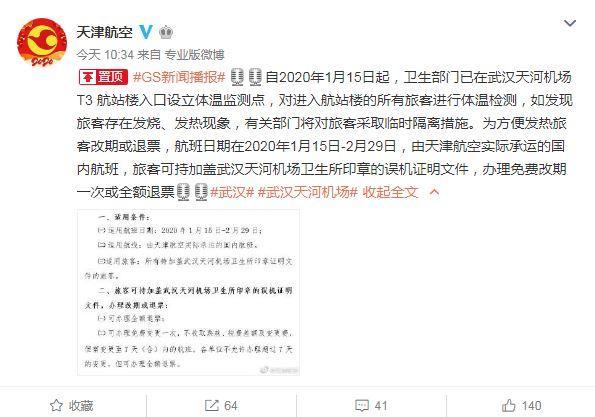 天津航空21日表示,自2020年1月15日起,卫生部门已在武汉天河机场T3航站楼入口设立体温监测点,对进入航站楼的所有旅客进行体温检测,如发现旅客存在发烧、发热现象,有关部门将对旅客采取临时隔离措施。为方便发热旅客改期或退票,航班日期在2020年1月15日-2月29日,由天津航空实际承运的国内航班,旅客可持加盖武汉天河机场卫生所印章的误机证明文件,办理免费改期一次或全额退票。