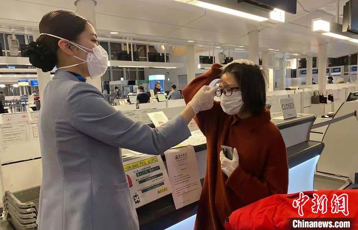 春秋航空日本工作人员为旅客测量体温。 春秋航空供图 摄
