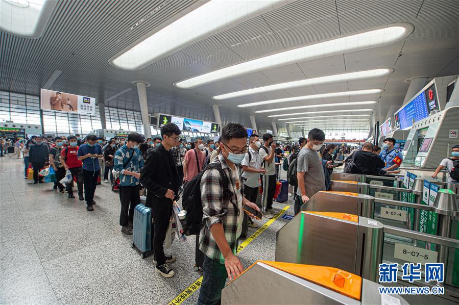 9月30日,旅客在杭州东站排队检票。 国庆、中秋“双节”来临,杭州东站迎来节前客流高峰。 新华社发(江汉 摄)
