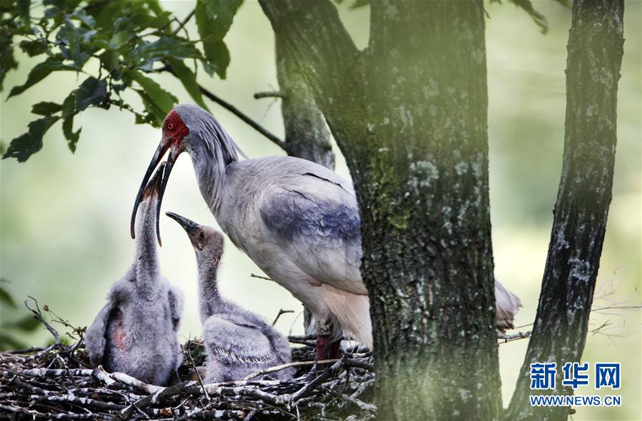 这是2018年6月2日,在中国陕西省汉中市洋县四郎镇田岭村的一片密林里,从远处觅食归来的朱鹮在巢里给幼鸟喂食。被称作“朱鹮故乡”的陕西省汉中市洋县时常能看到珍稀鸟类朱鹮的身影。朱鹮是地球上最古老的鸟类之一。二十世纪中叶以来,由于战争、猎杀和生态破坏等原因,这种珍禽的栖息地面积不断缩小,种群数量锐减,俄罗斯、韩国、日本相继宣布野生朱鹮绝迹。1981年中国研究人员发现7只野生朱鹮孤羽。在随后日渐完善的保护体系中,中国的朱鹮野生种群由7只发展到2000余只,并构建了若干人工种群。一些朱鹮还远赴日本和韩国,在当地保护工作者的努力下繁衍种群。 新华社记者 陶明摄