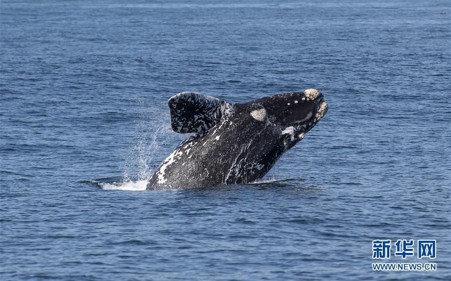 这是2018年9月30日,在南非赫曼纽斯小镇附近海面上,一头南露脊鲸跃出海面。 新华社记者 陈诚 摄