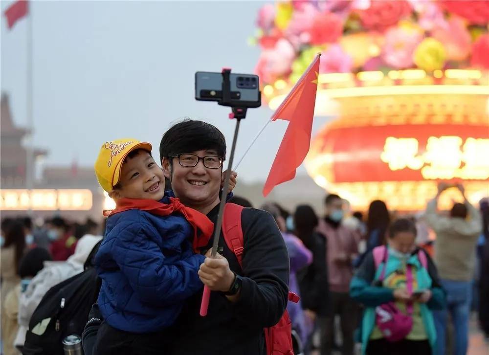 10月1日,人们在北京天安门广场拍照游览。新华社记者 李贺 摄