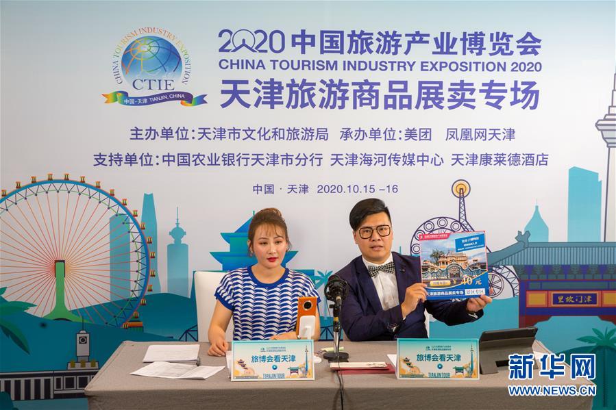 10月15日,在2020中国旅游产业博览会上,主播通过直播推介天津的旅游景区。 新华社发