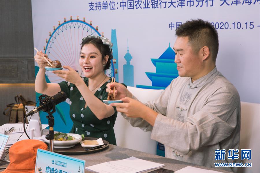 10月16日,在2020中国旅游产业博览会上,主播通过直播推介美食。 新华社发