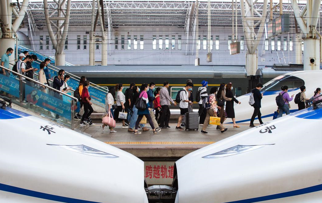 2020年9月30日,旅客在江苏南京火车站乘车出行。当日是国庆中秋假期前一天,全国铁路迎来客流高峰。来自中国国家铁路集团有限公司的数据显示,自9月28日至10月8日,全国铁路预计发送旅客1.08亿人次,日均982万人次。