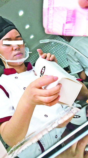 记者卧底时,使用夹着扑克牌的百元大钞购买糕点记者偷拍截图