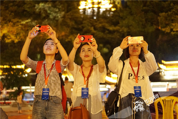 媒体记者拿出手机记录下夜晚蚩尤九黎城美景 见习记者 冉桐摄