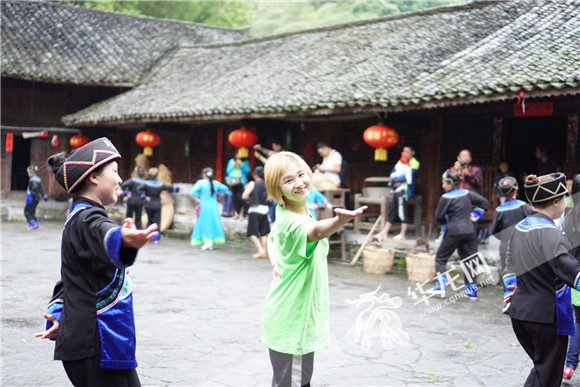 荆楚网记者蒋成凤在黔江十三寨跳摆手舞 见习记者 冉桐摄
