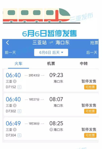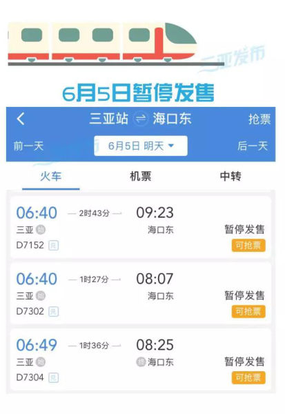 注意!6月5日起三亚高铁暂停预售 汽车停止发班