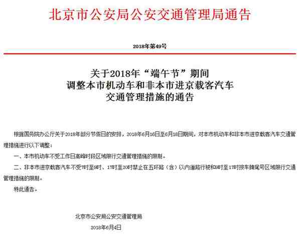 近日,北京市公安局公安交通管理局在其官网上发布了《关于2018年“端午节”期间调整本市机动车和非本市进京载客汽车交通管理措施的通告》。《通告》显示,根据国务院办公厅关于2018年部分节假日的安排,2018年6月16日至6月18日期间,北京市机动车不受工作日高峰时段区域限行交通管理措施的限制,同时,非北京市进京载客汽车不受7时至9时、17时至20时禁止在五环路(含)以内道路行驶和9时至17时按车牌尾号区域限行交通管理措施的限制。