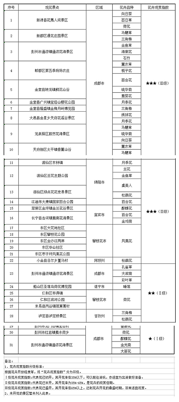 据了解,本期推荐有成都市金堂县转龙镇鲜花山谷的蜀葵花、天府新区太平镇香薰山谷的薰衣草、新都区漫花庄园景区的马鞭草、彭州市通济镇通济花海景区的海棠花、大邑县金星乡天府花溪谷景区的绣球花、郫都区第五季妈妈农庄的栀子花、宜宾市长宁县古河镇蜀南花海景区的百合花、阿坝州小金县日尔乡董马村的杜鹃花、攀枝花市东区枣子坪凤凰花公园的凤凰花、攀枝花市仁和区布得镇的荷花,周末将至,相约亲朋好友,一起去邂逅花的艳丽与芬芳。