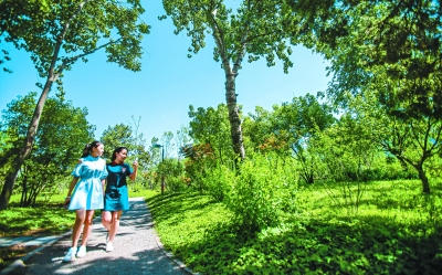 日前,菜市口地铁站附近的广阳谷城市森林中,市民正愉快散步。 本报记者 武亦彬摄