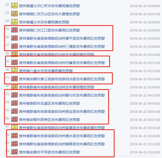 贵州全省各地有108个气象灾害警报与预警信号正在预警中