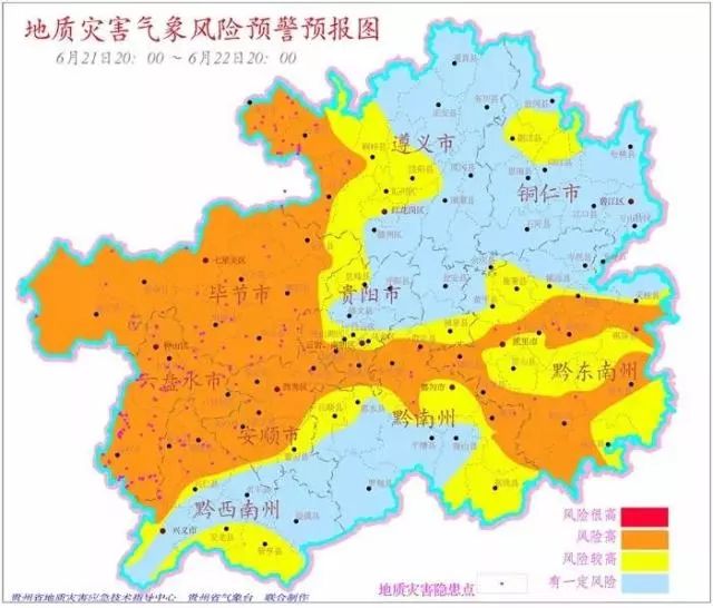 橙色预警,即地质灾害气象风险高,共有39个县(市、区、新区):清镇、花溪、六枝、盘州、水城、钟山、毕节市(含七星关、大方等7个县区)、安顺市(含西秀、普定等6个县区)、贵安新区、赤水、习水、仁怀、普安、晴隆、兴仁、龙里、贵定、麻江、丹寨、三都、榕江、从江、黎平、凯里、台江、剑河、三穗、天柱。