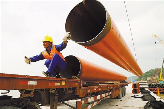 6月21日下午,在珠海横琴屹陡石湾的磨刀门水域,金海大桥工地正热火朝天地施工中。记者在现场看到,施工栈桥已逐步向海中央延伸,桥的一侧正在进行临时桩的施工,现场工作人员介绍,金海大桥为四塔斜拉桥,每一个主塔墩由20根桩组成,其中每个桩直径为3米。据了解,磨刀门水域深处是较少见的花岗岩地质,水域上层水浅且淤积较深,最底部为花岗岩,为施工带了一定挑战。