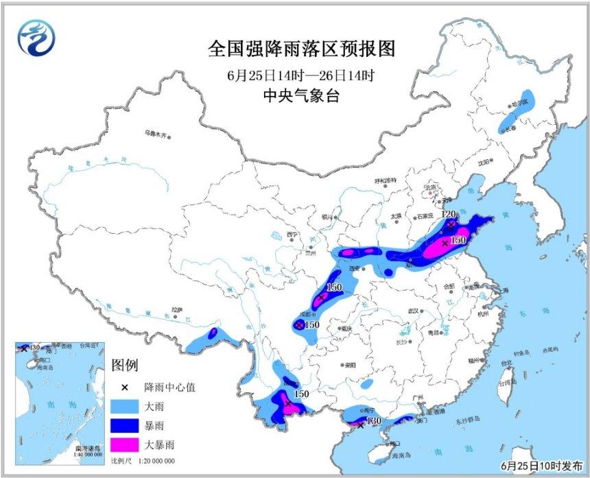 预计25日14时至26日14时,山东大部、河南北部、山西南部、陕西中部和西南部、宁夏南部、甘肃东南部、四川盆地西部和北部、广西南部沿海和北部、广东西南部沿海、海南岛南部、云南西北部和中南部、西藏东南部等地的部分地区有大雨或暴雨,局地大暴雨(100~150毫米);上述部分地区伴有短时强降水(最大小时降水量40~60毫米,局地70毫米以上)。
