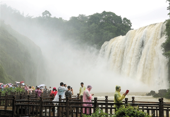 贵州黄果树瀑布水势磅礴让游客惊喜 新华社记着 卢维 摄