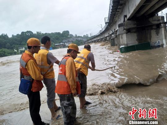 铁路工作人员在宝成铁路“清江河大桥”上观测江面水位情况。 钟欣 摄