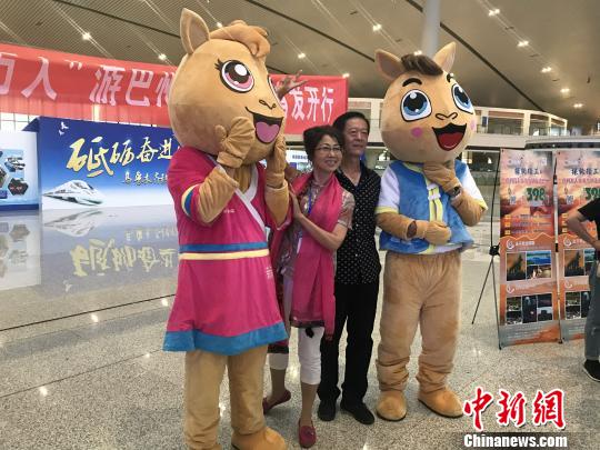 在乌鲁木齐站,参加“坐着火车游新疆—百列万人游巴州”活动的旅客与公仔合影留念。 迪娜 摄
