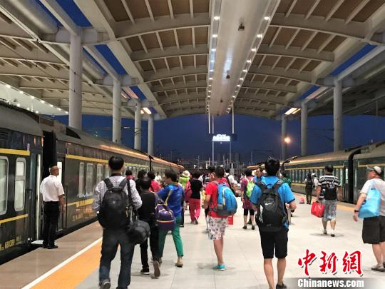 参加“坐着火车游新疆—百列万人游巴州”活动的旅客匆匆走向Y966次“轩言”号旅游专列。 迪娜 摄